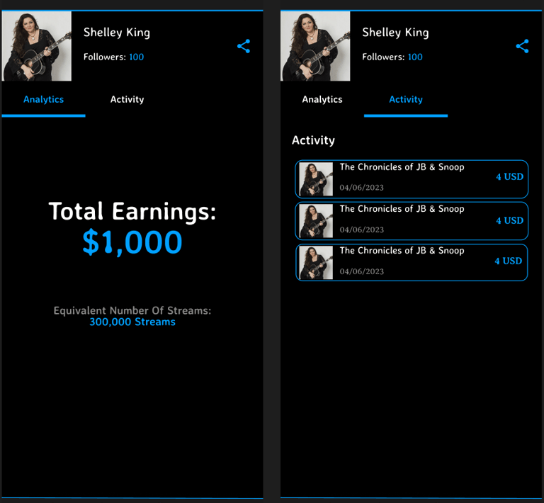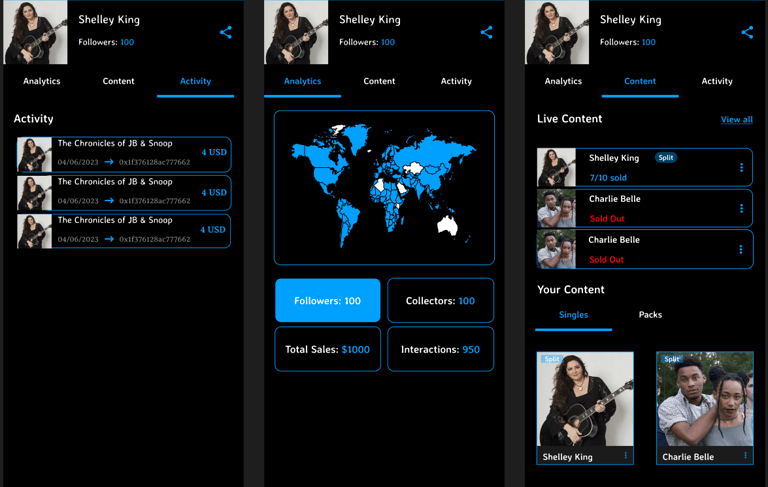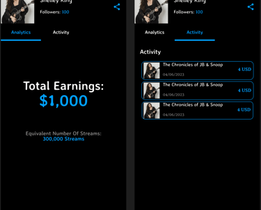 The initial prototype looked to overhaul the content management view and give users analytics from their drops on the TuneGO Marketplace. The content management changes looked to make recent content easier to access. This would happen in the following ways: